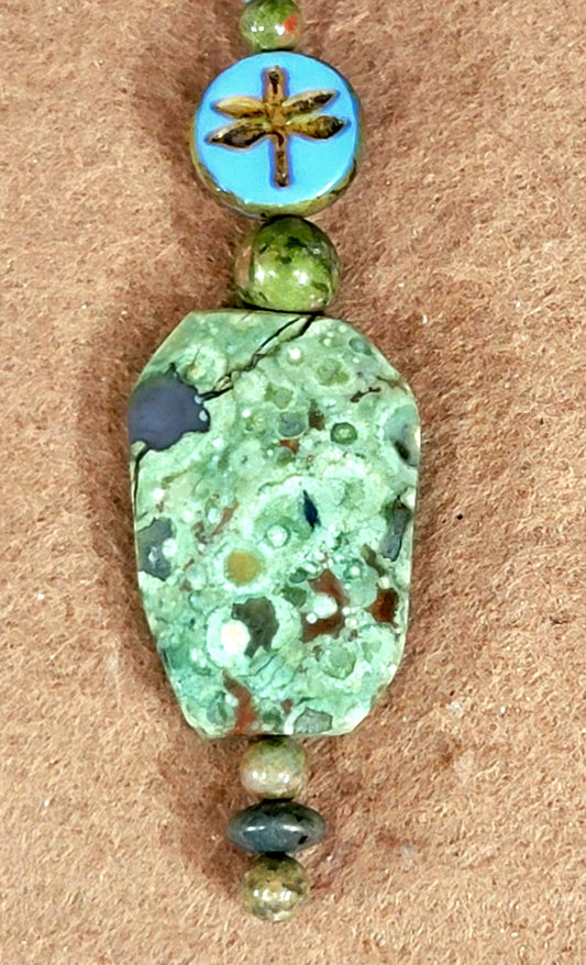 Green Agate Drop Bead: Unakite & Angelite W/ Twirling Dragonfly