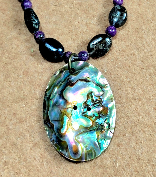 Opalescent Mother of Pearl pendant: Highlighted by the deep rich color of Sugilite and the flashing Chatoyance in Labradorite