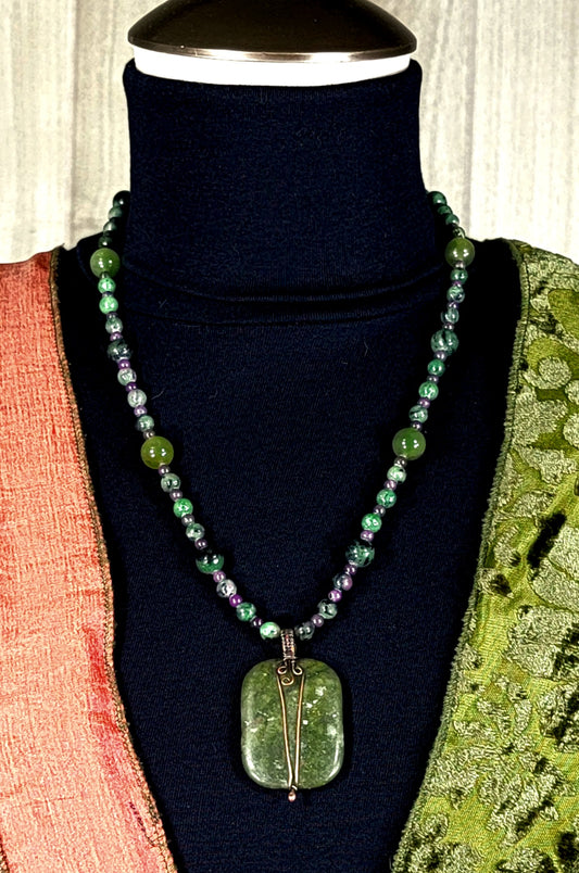 Jade pendant. Surrounded by the rich purples of Sugilite the forest greens of Aventurine & Ruby red of Zoisite.