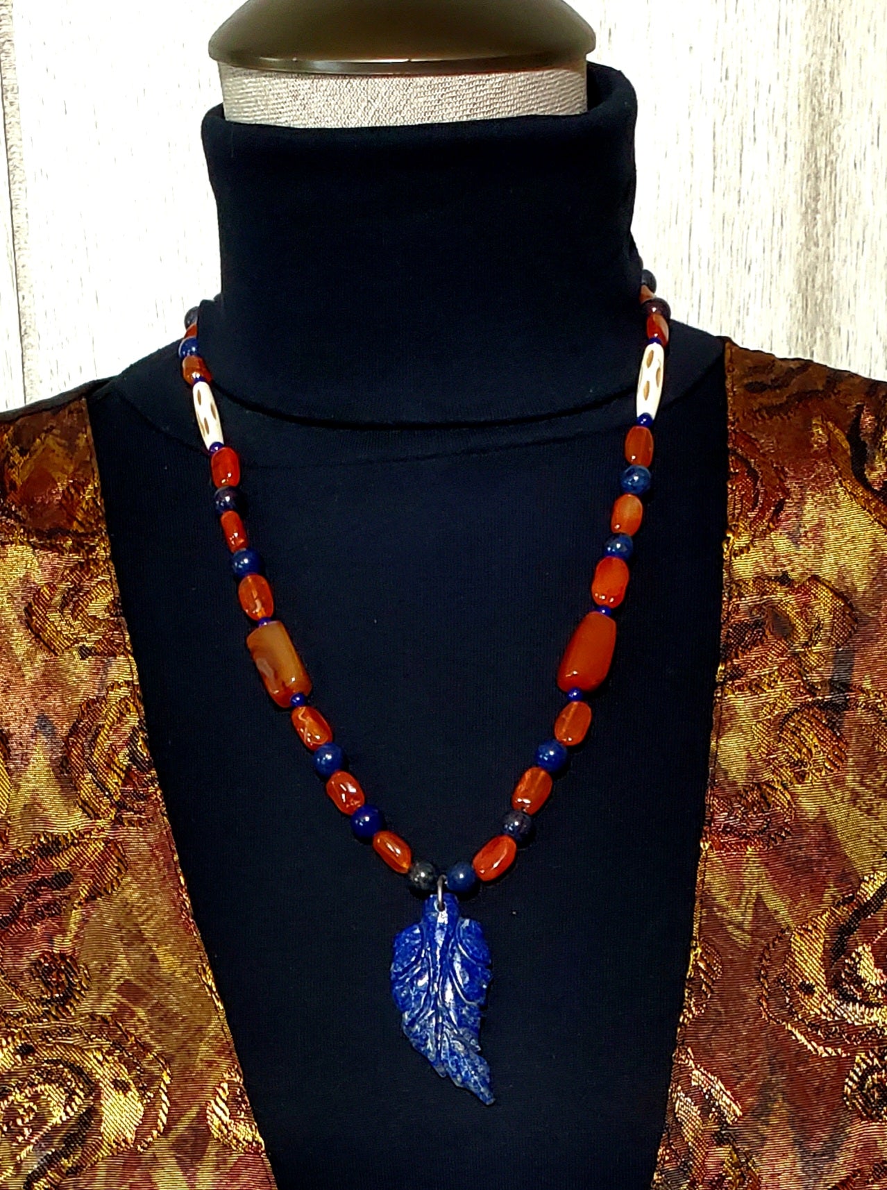 Lapis Leaf Pendant: Carnelian, Azurite & Bone