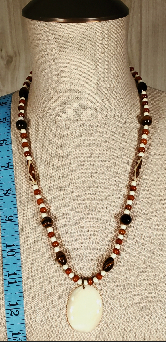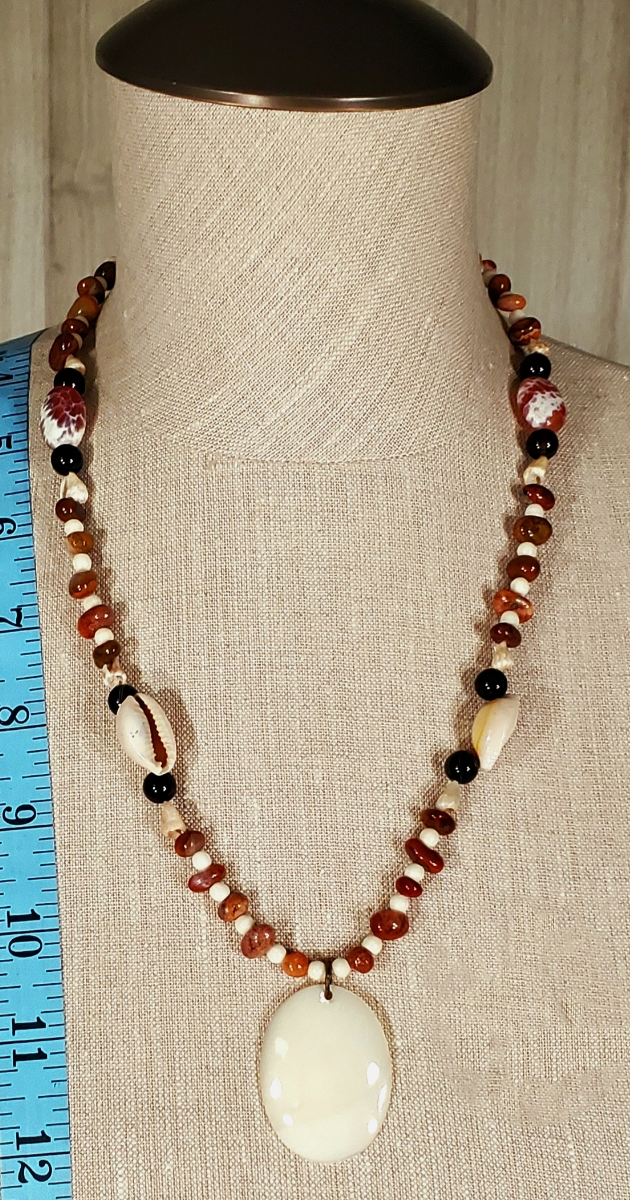 Necklace One: Abalone, Carnelian, Black Agate, Shell, Bone & Agate. Necklace Two: Abalone, Tiger Eye & Bone