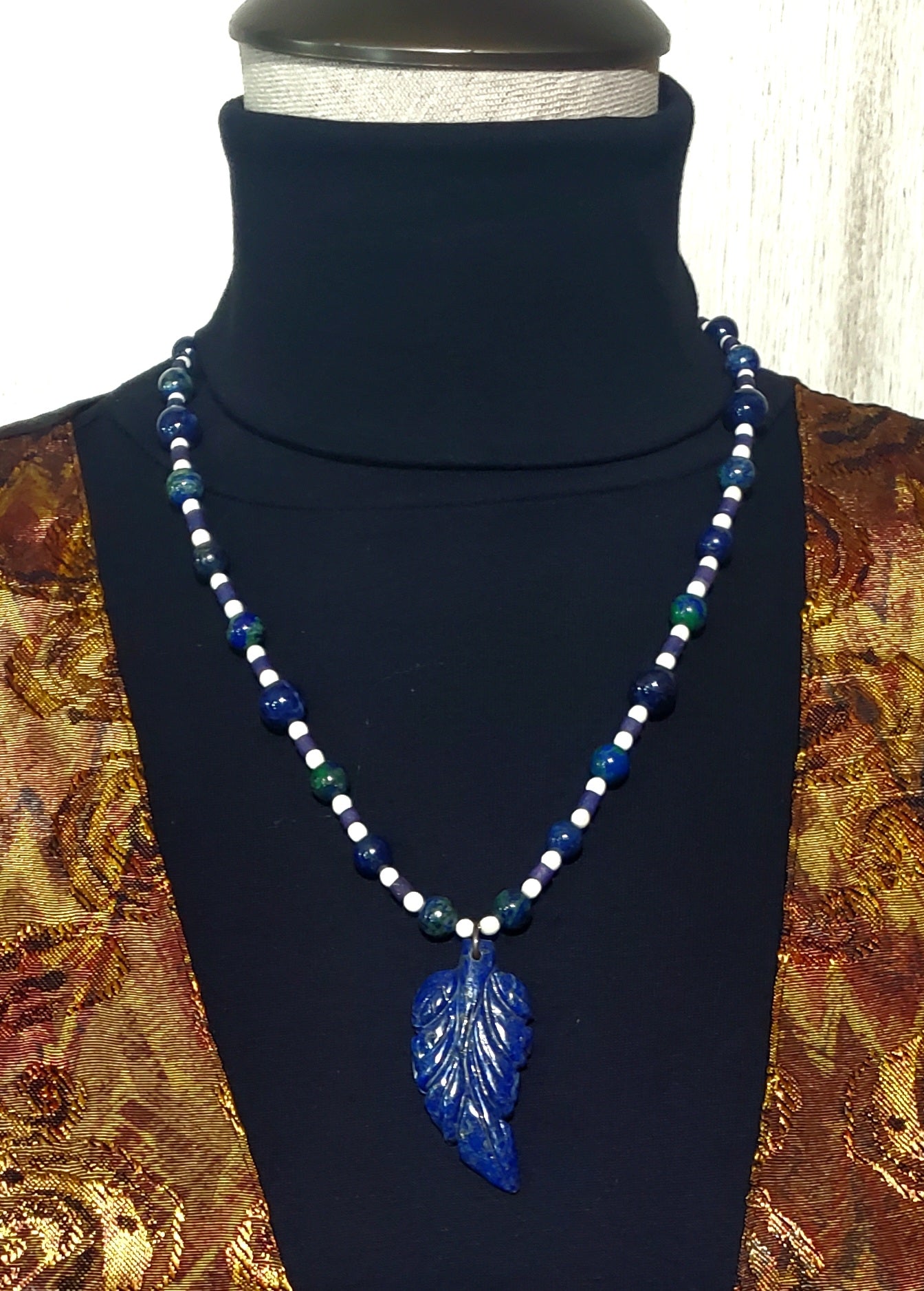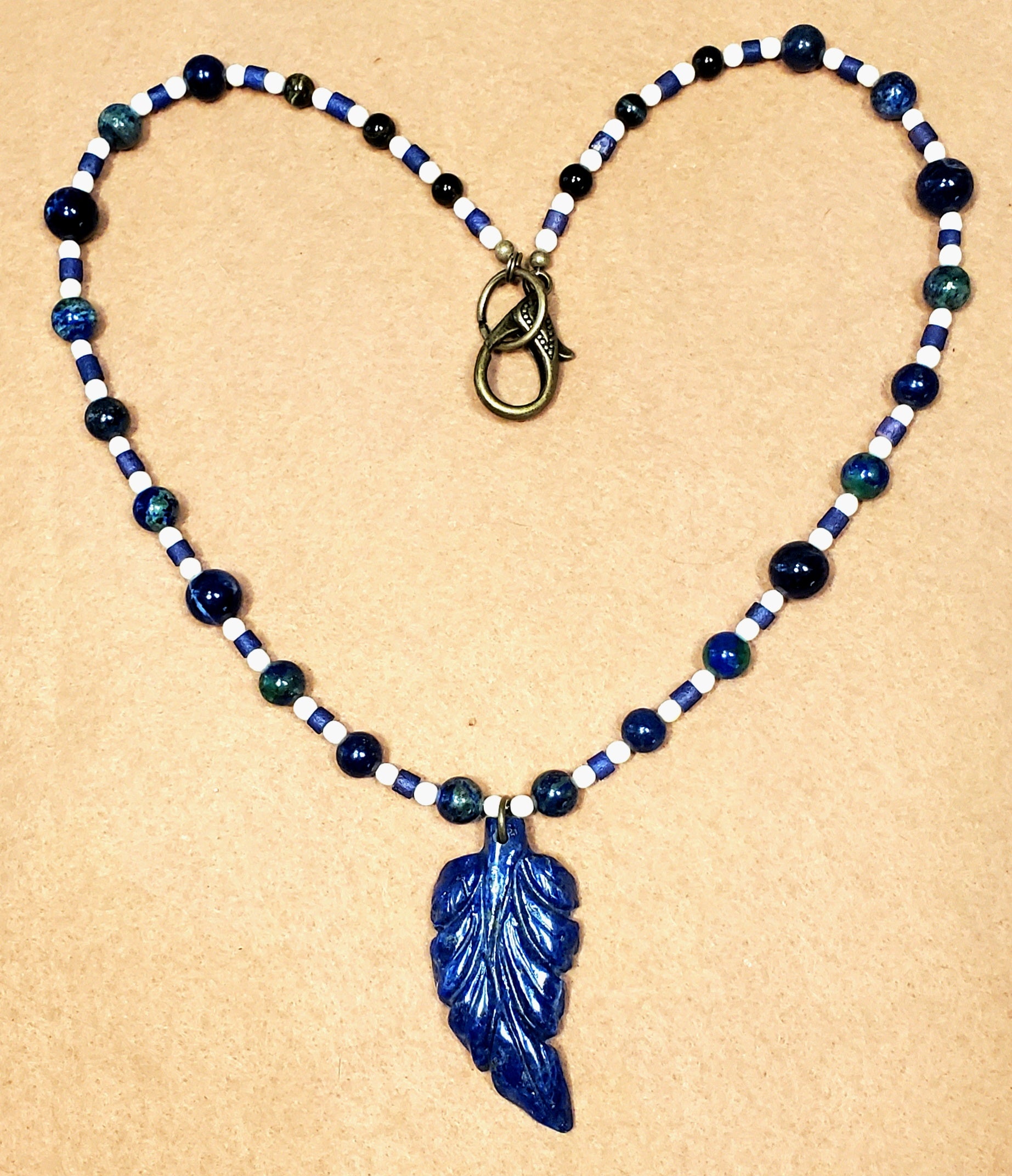 Lapis Leaf Pendant: Malachite-Azurite, Lapis, Bone & Reed