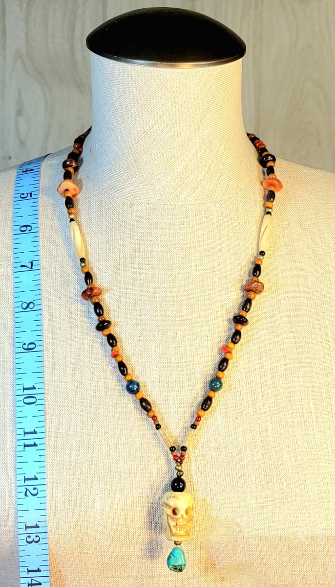 Necklace two: Skull bone drop bead, Turquoise, Apatite, Carnelian & Red Tiger Eye