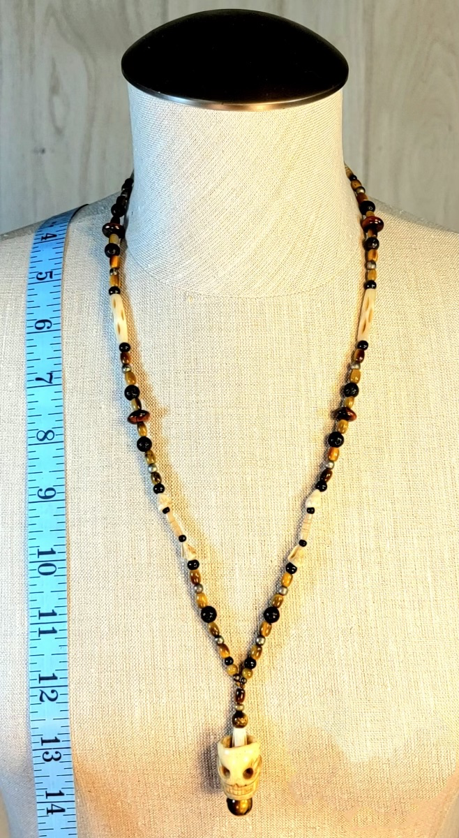 Necklace one: Skull bone drop bead, Red Tiger Eye, Bone, Shell & Lava