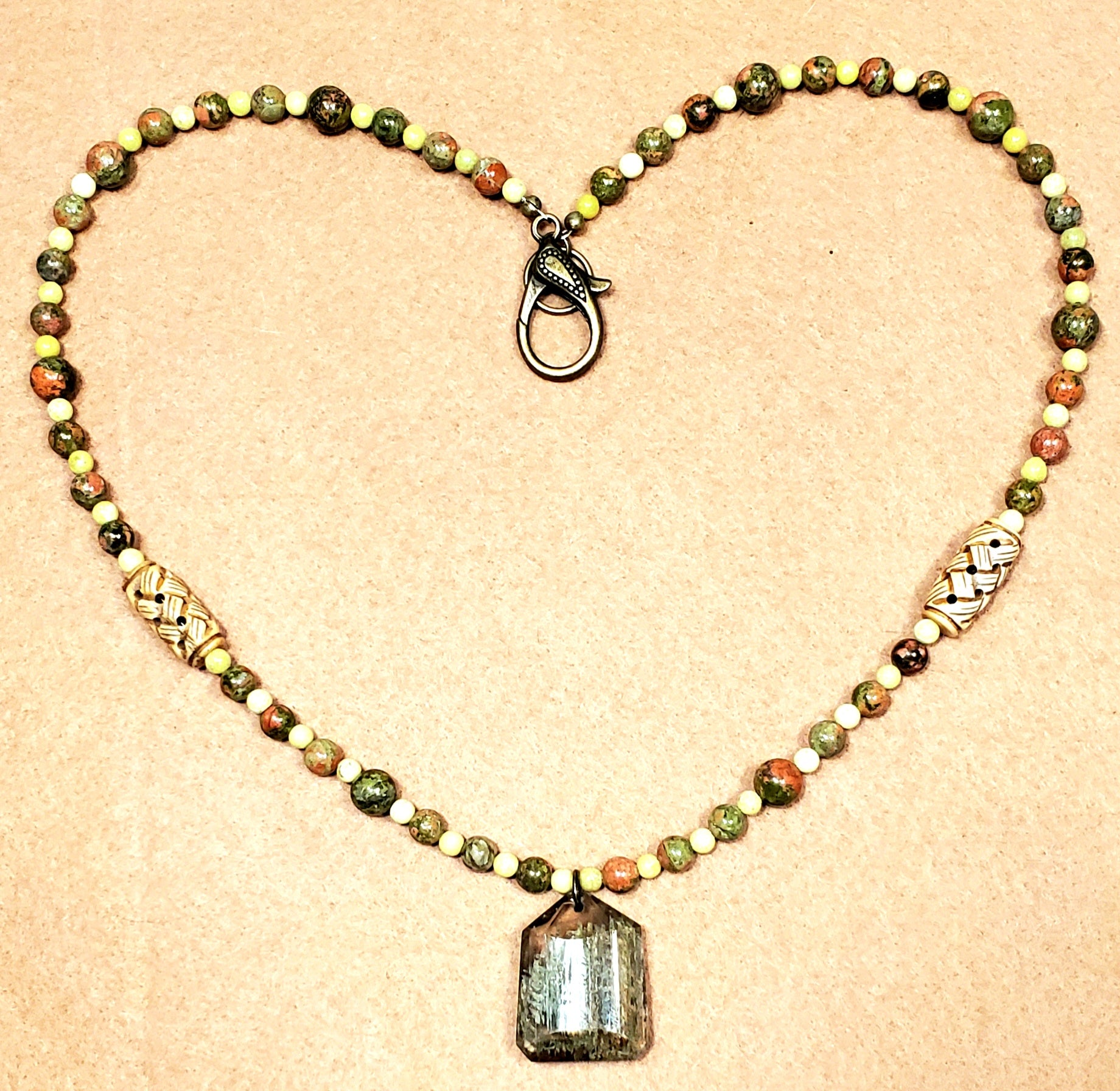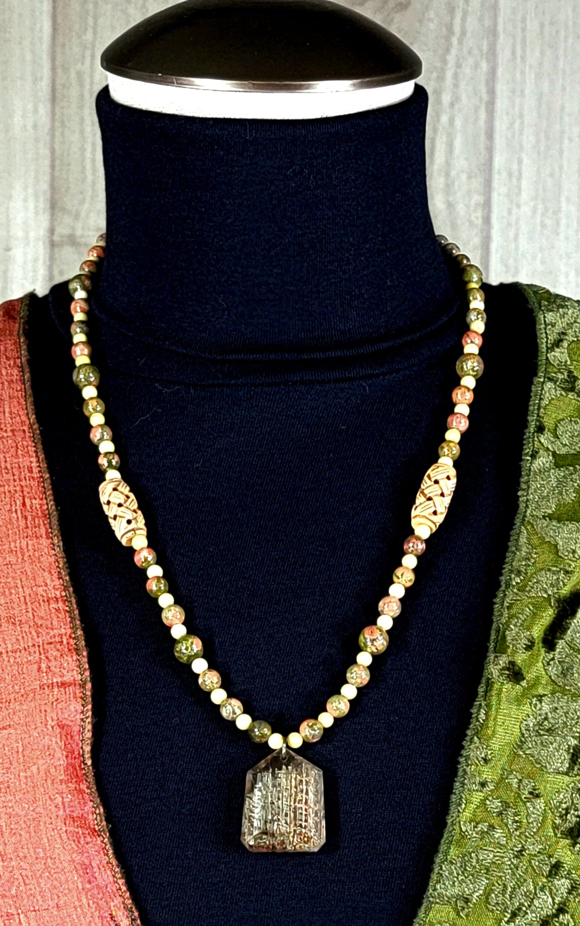 Rutilated Quarts Pendant: Yellow Turquois, Unakite & Bone