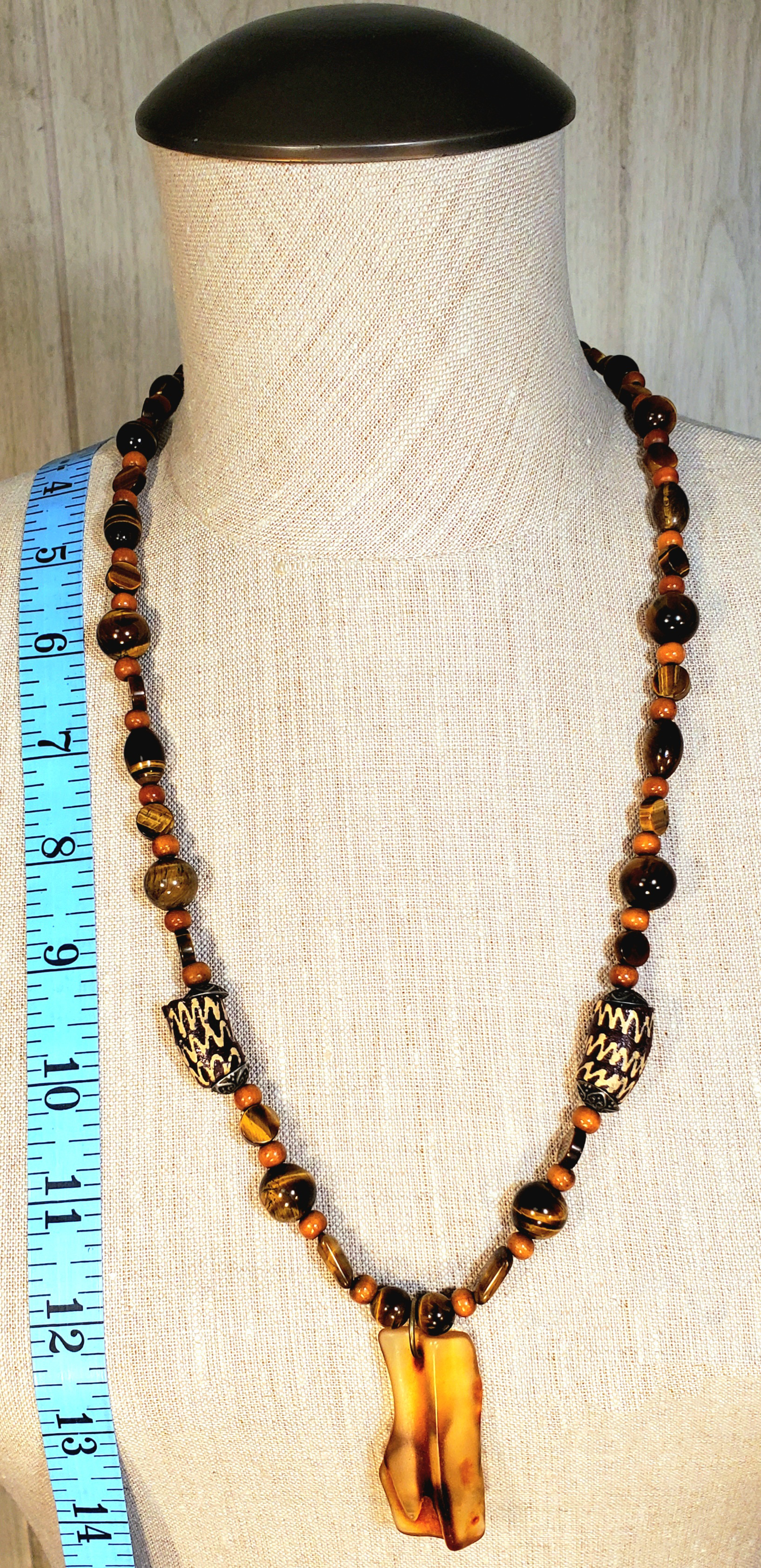 Amber Pendant: Brown Tiger Eye, Bone & Wood
