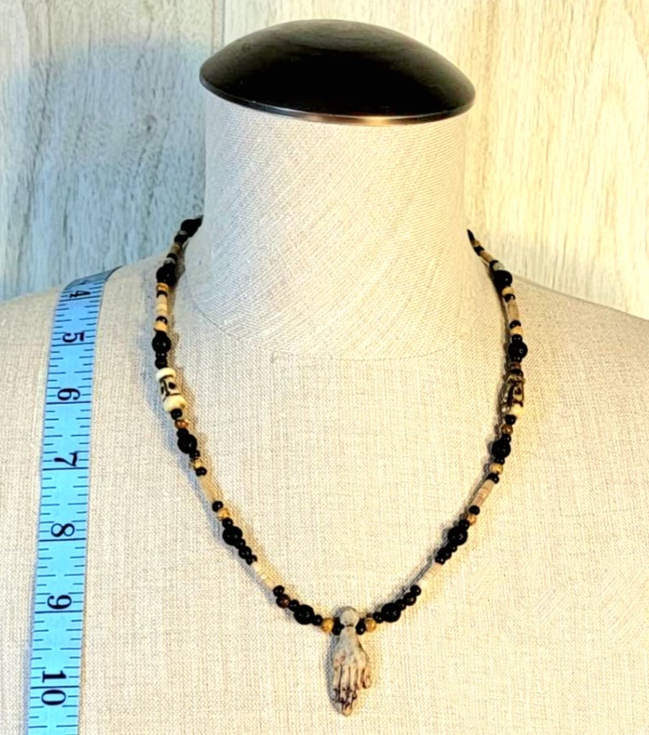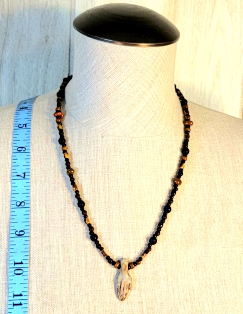 Necklace one: Jasper, Bone, Seed, Lava & Wood.