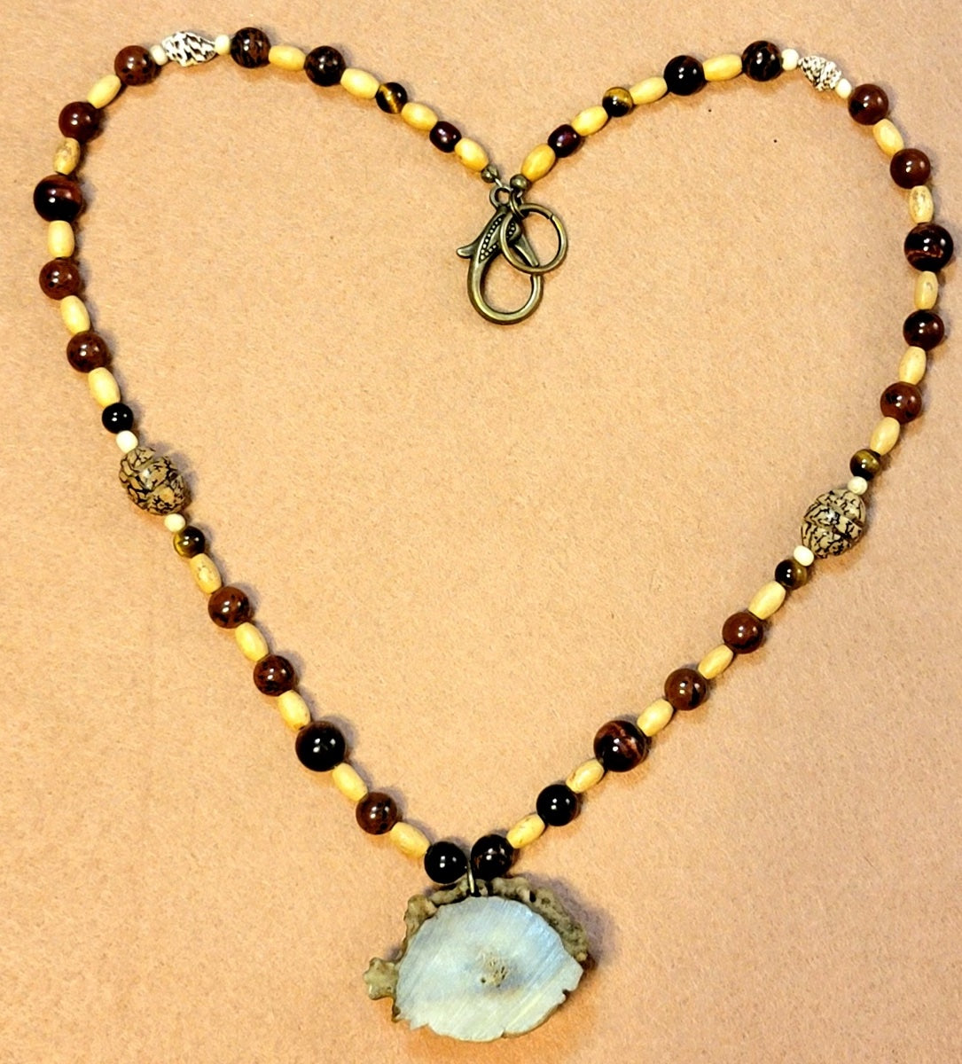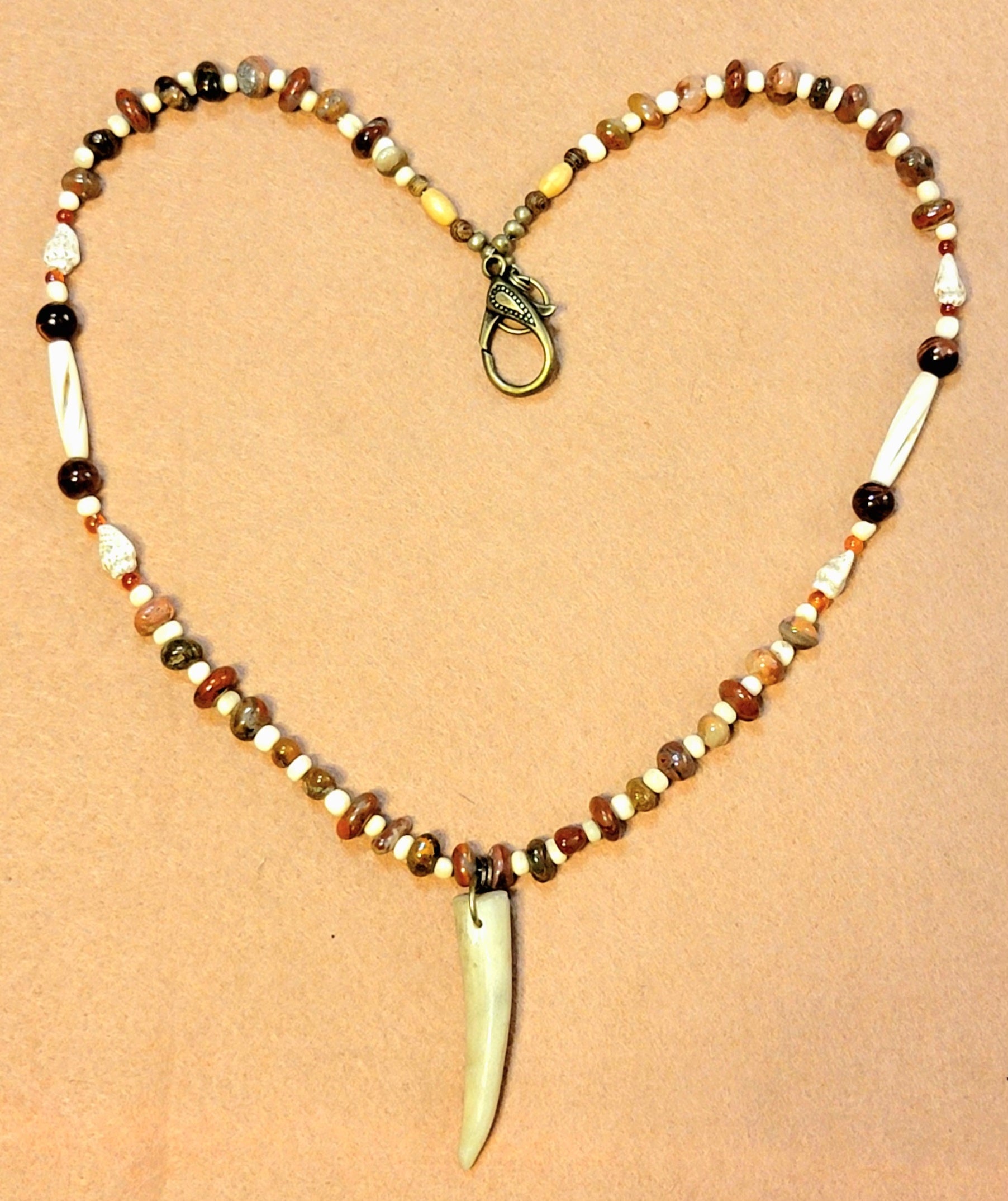 Necklace one: Antler Button Red Tiger Eye, Bone, Shell & Mahogany Obsidian, Necklace two: Antler Point Red Tiger Eye, Carnelian, Fire Agate, Bone & Shell