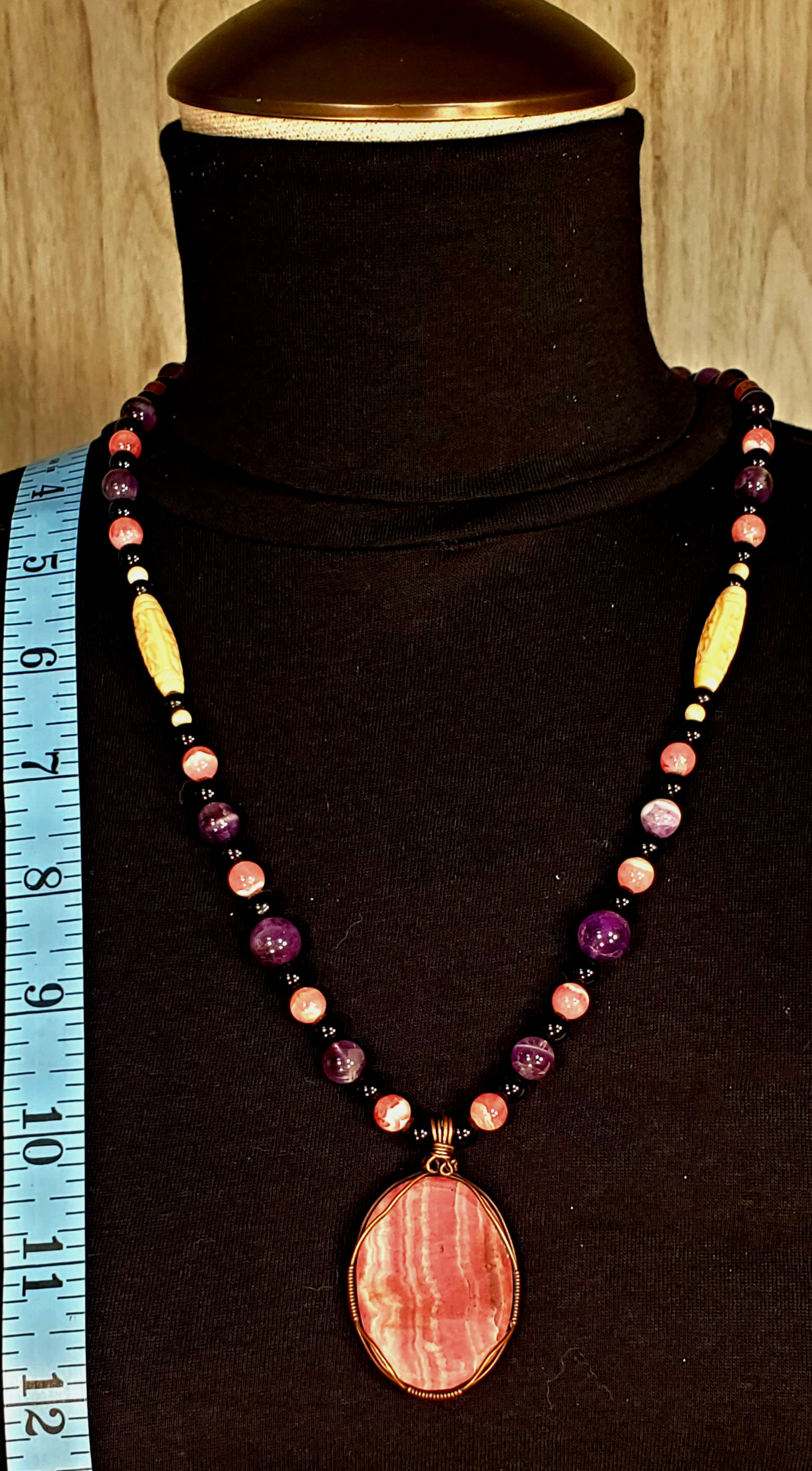 Rhodochrosite Cabochon: Black Tourmaline, Chevron Amethyst, Rhodalite, Amethyst, Bone & Seed & seed