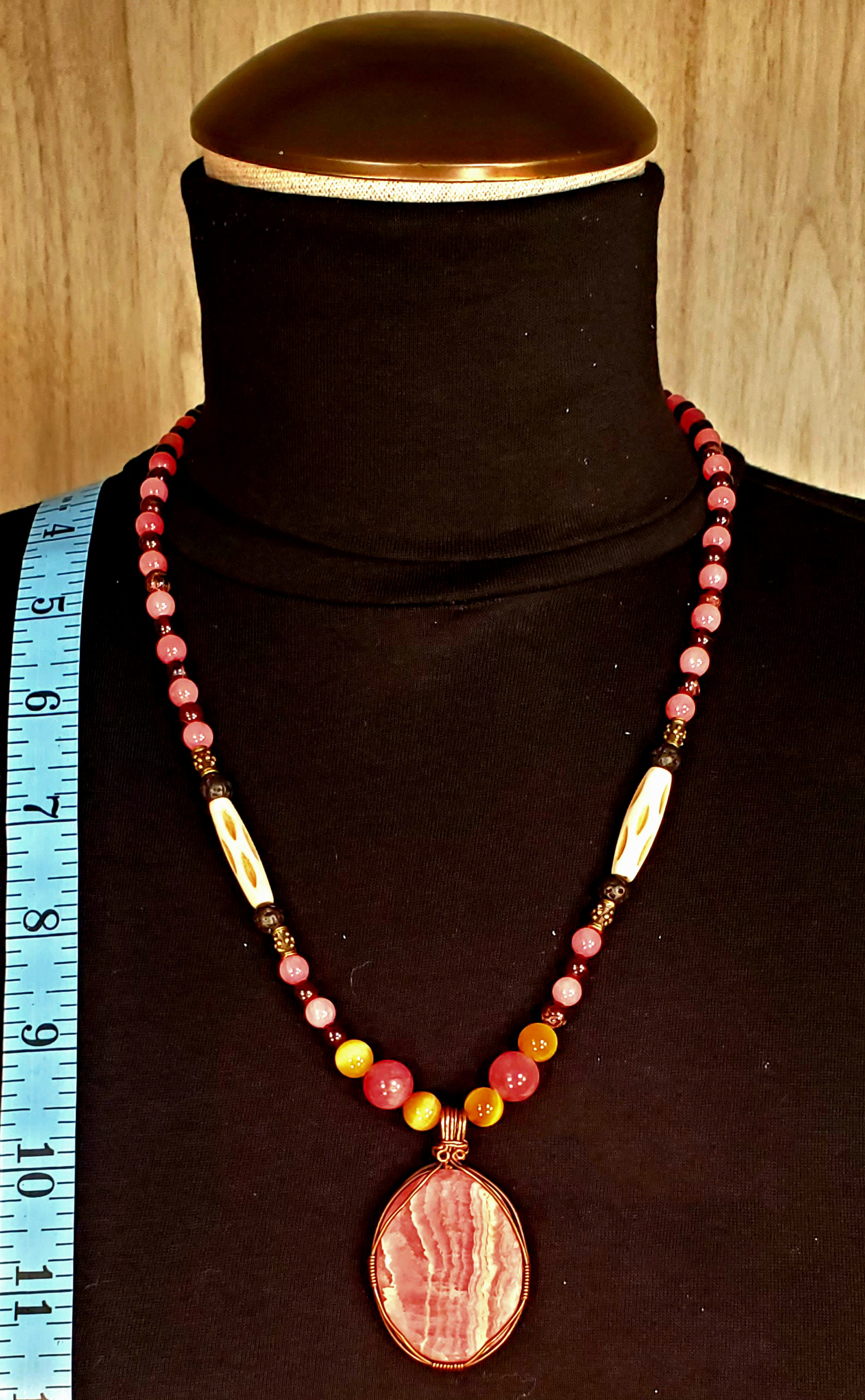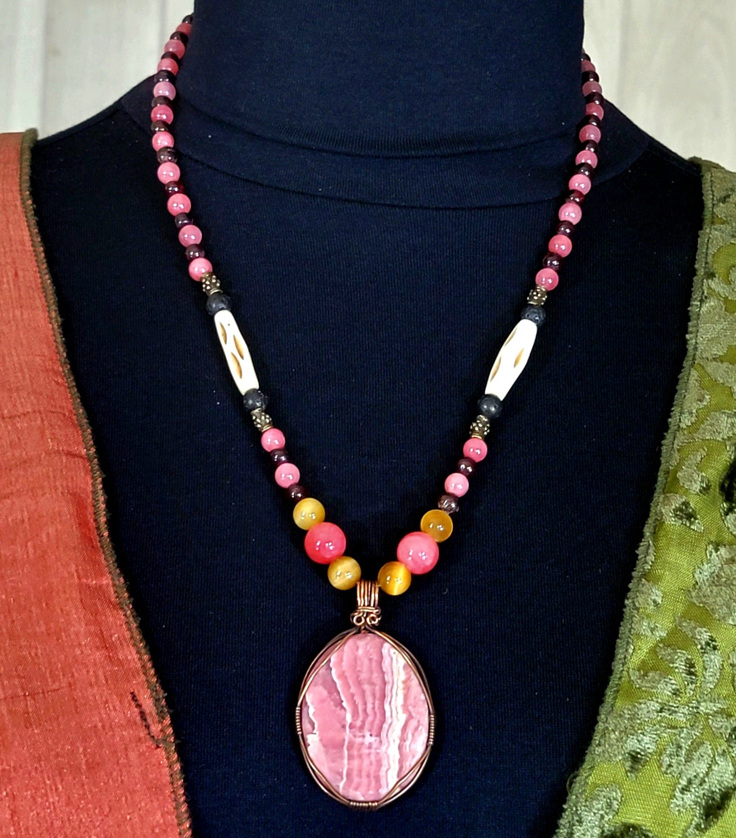 Rhodochrosite Cabochon: Yellow Tiger Eye, Rose Quarts, Garnet, Lava & Bone