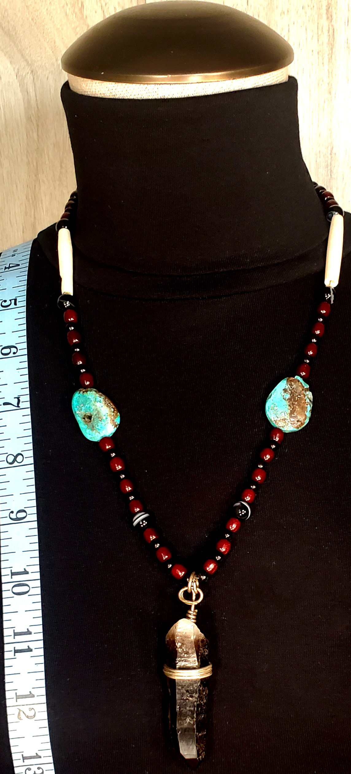 Smokey Quarts Point: Vintage Turquoise, Black Onyx & Bone